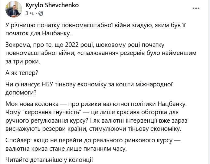 "Левову частину цих коштів купує не населення України, яке стрімко бідніє під час війни. Кошти на купівлю валюти надходять із тіньового сектора. Це означає, що валютні інтервенції НБУ побічно фінансують тіньову економіку, використовуючи для цього міжнародну допомогу", - написав Шевченко.