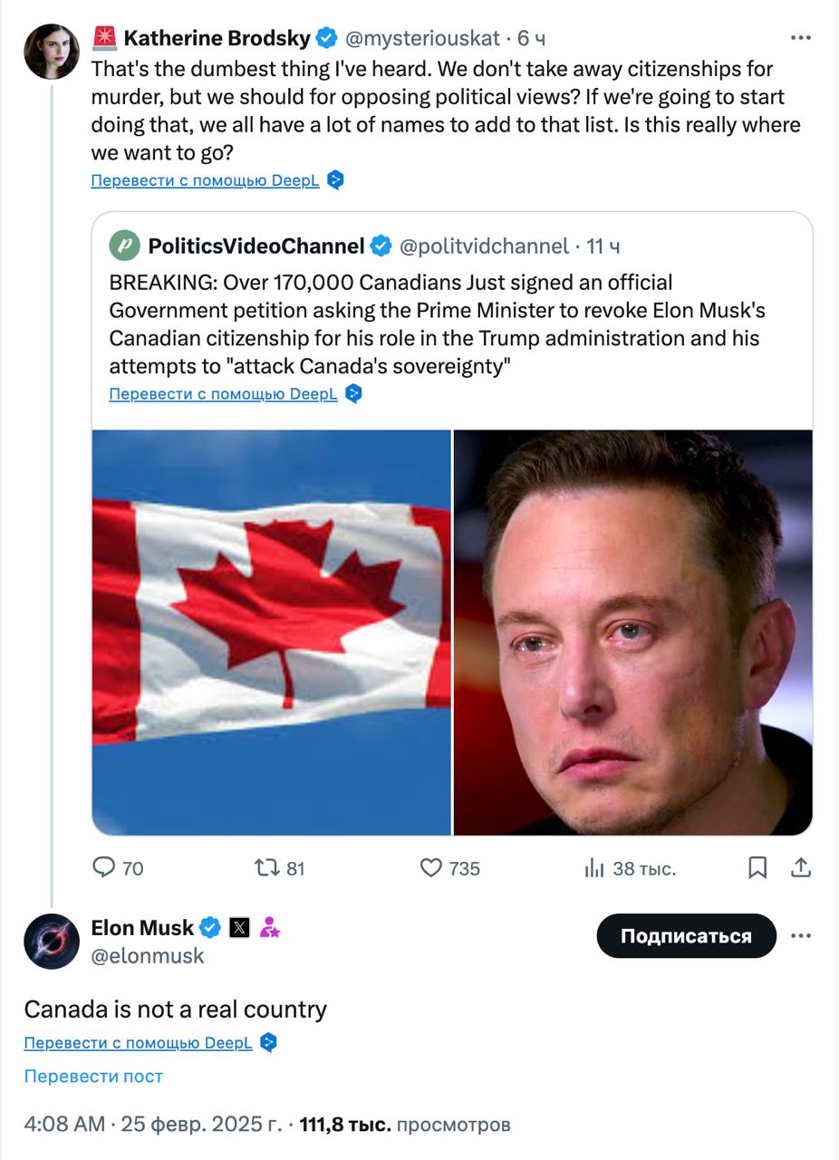 Понад 170 000 канадців підписали петицію із закликом позбавити главу Департаменту ефективності уряду США (DOGE) Ілона Маска канадського громадянства. У відповідь на це він назвав Канаду "несправжньою країною".