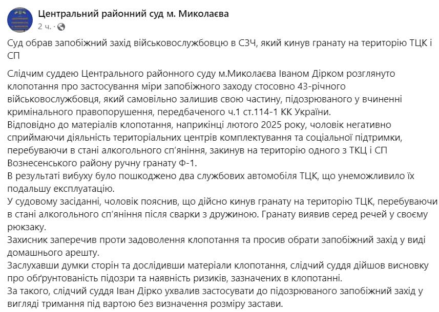 Центральний районний суд Миколаєва обрав запобіжний захід 43-річному військовослужбовцю, який самовільно залишив свою частину, підозрюваного в протидії ЗСУ (ч.1 ст.114-1 Кримінального кодексу). Чоловік кинув гранату на територію ТЦК та СП Вознесенського району.
