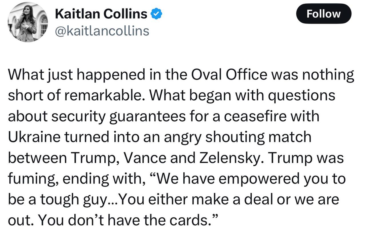 "Те, що почалося з питань про гарантії безпеки при припиненні вогню з Україною, перетворилося на гнівну суперечку між Трампом, Венсом і Зеленським. Трамп лютував і закінчив словами: "Ми дали вам можливість бути крутим хлопцем... Або ви укладаєте угоду, або ми виходимо. У вас немає карток". Український посол схопилася за голову в цей момент", - написала Коллінз.