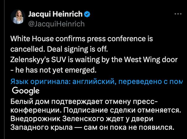 Тим часом журналістка телеканалу Fox News Джекі Генріх написала в Х, що прес-конференцію Зеленського та Трампа після зустрічі скасували, а підписання угоди про надра не відбудеться.