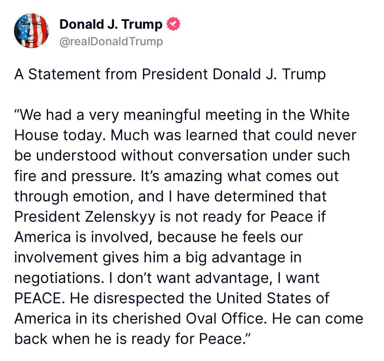 "Сьогодні у нас була дуже значуща зустріч у Білому домі. Було витягнуто багато чого, що ніколи не могло бути зрозуміло без розмови під таким вогнем і тиском. Дивно, що проявляється через емоції, і я прийшов до висновку, що президент Зеленський не готовий до миру, якщо Америка бере участь у цьому, тому що він вважає, що наше. виявив неповагу до Сполучених Штатів Америки в їхньому священному Овальному кабінеті.