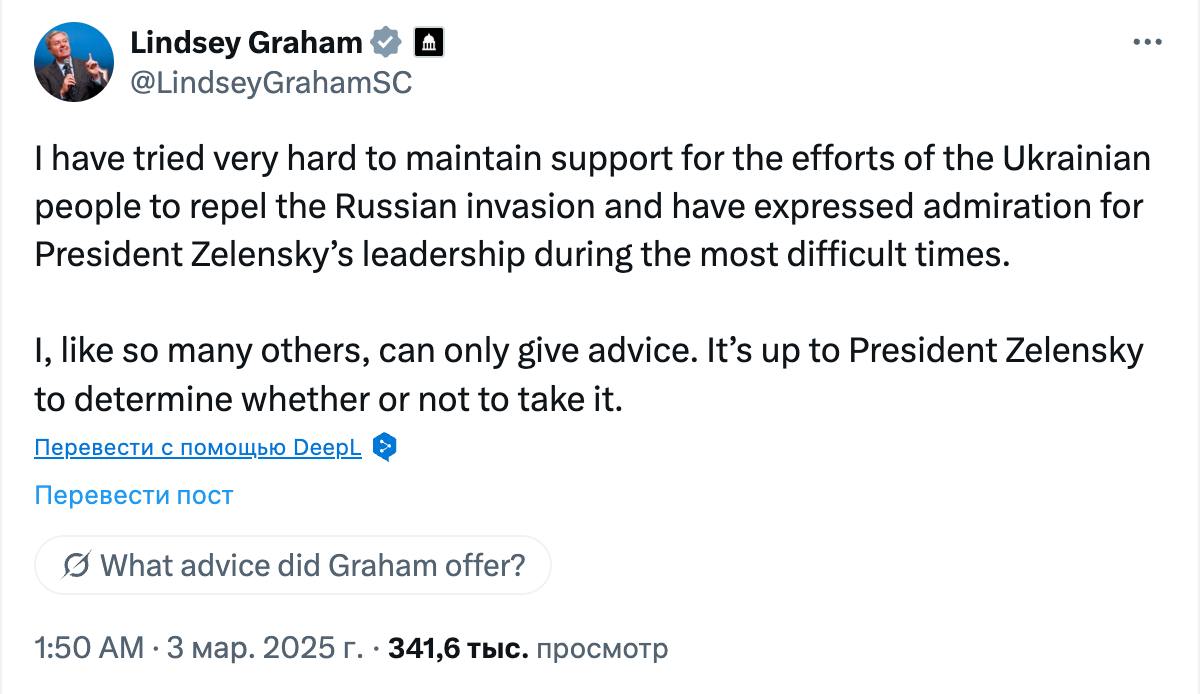 Також Грем додав, що Зеленський сам має вирішити, чи приймати його поради чи ні.