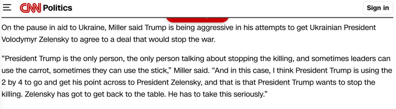 "Президент Трамп - єдина людина, єдина людина, що говорить про припинення вбивств, і іноді лідери можуть використовувати пряник, іноді вони можуть використовувати батіг. І в цьому випадку, я думаю, президент Трамп використовує палицю, щоб піти і донести свою точку зору до президента Зеленського, і вона полягає в тому, що президент Трамп хоче припинити". о", - заявив Міллер.