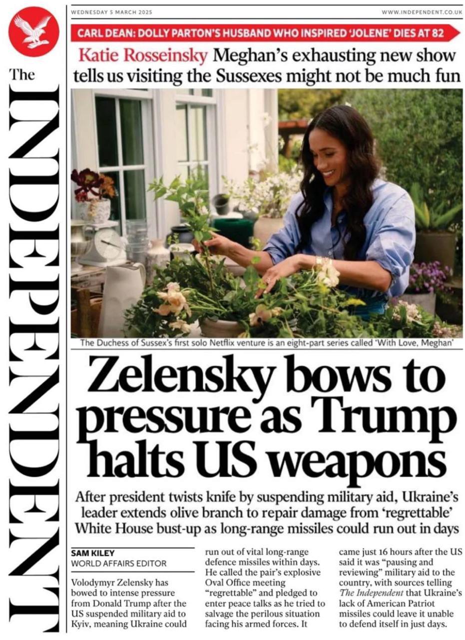 Видання The Independent вийшло із заголовком на першій сторінці: "Зеленський поступається тиску, оскільки Трамп припиняє постачання зброї США".