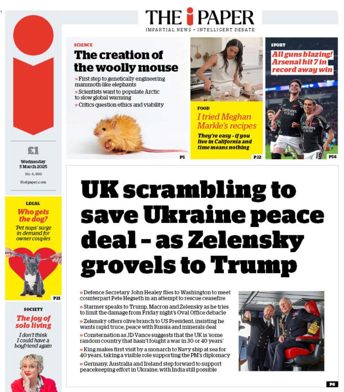 Додаток цієї газети - щоденна The i Paper - пише, що "Зеленський принижується перед Трампом", а "Великобританія відчайдушно намагається врятувати мирну угоду про Україну".
