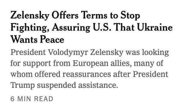 Схожий за змістом заголовок з елементом сумніву в словах українського президента публікує американська The New York Times: "Зеленський пропонує умови для припинення бойових дій, запевняючи США, що Україна хоче миру".