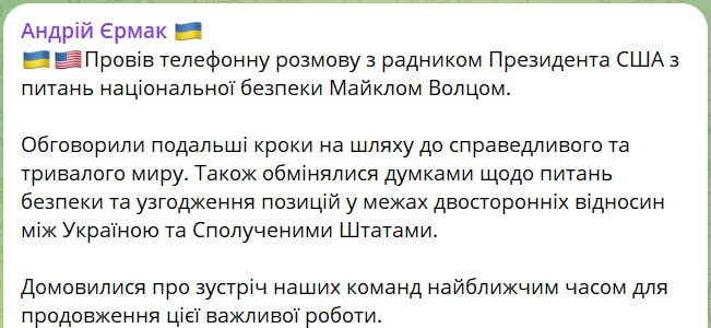 "Обговорили подальші кроки на шляху до справедливого та тривалого світу. Також обмінялися думками щодо безпеки та узгодження позицій у рамках двосторонніх відносин між Україною та Сполученими Штатами. Домовилися про зустріч наших команд найближчим часом для продовження цієї важливої роботи", – написав Єрмак у своєму телеграм-каналі.