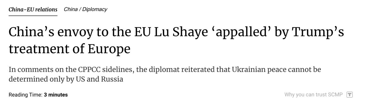 "Якщо подивитися на те, як адміністрація Трампа проводить нахабну і деспотичну політику щодо Європи, звертаючись таким чином зі своїми союзниками, то, чесно кажучи, з європейської точки зору це просто жахливо. Я вважаю, що європейські друзі повинні поміркувати над цим і порівняти політику адміністрації Трампа з політикою"., дружбу, добру волю та взаємовигідну співпрацю", - заявив китайський дипломат.