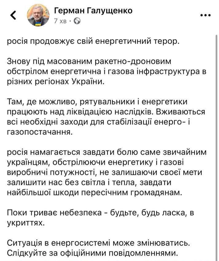 "росія намагається завдати біль саме звичайним українцям, обстрілюючи енергетику та газові виробничі потужності, не залишаючи своєї мети залишити нас без світла та тепла, завдати найбільшої шкоди пересічним громадянам", - написав міністр.