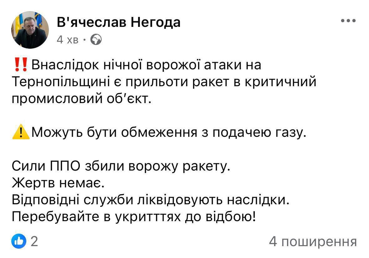 У Тернополі заявили про відключення газу через влучення в промисловий об'єкт.