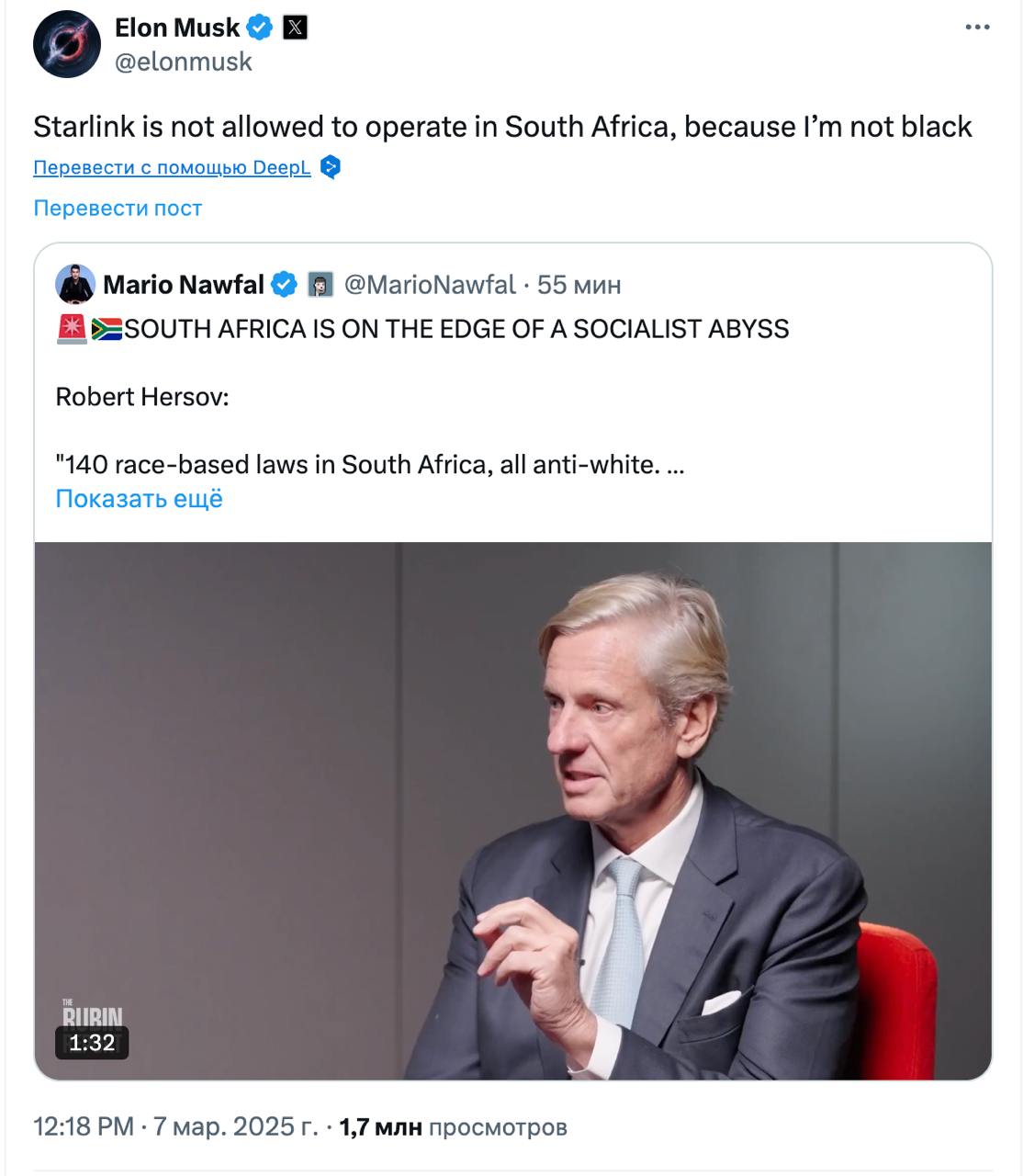 "Starlink не дозволено працювати у Південній Африці, бо я не чорний", - написав мільярдер.