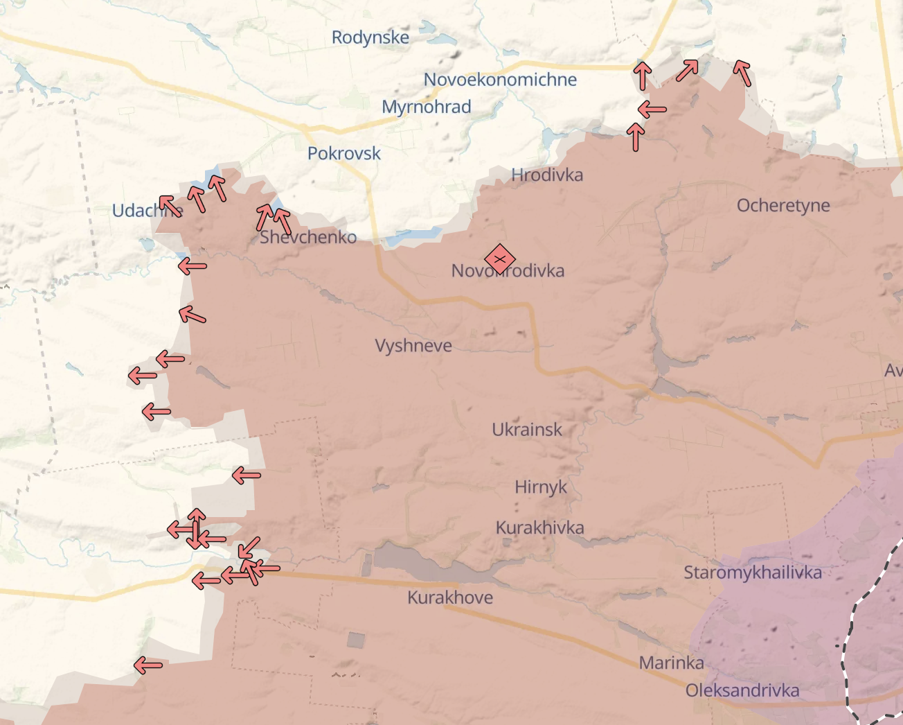 У той же час паблики РФ пишуть, що напружена ситуація зберігається. У тому числі й через вразливість логістики російських військ на виступі на південний захід від Покровська, який з різних боків прострілюється українськими дронами. Тобто, ймовірно, слід очікувати нових спроб ЗСУ атакувати та просунутися на цьому напрямі.