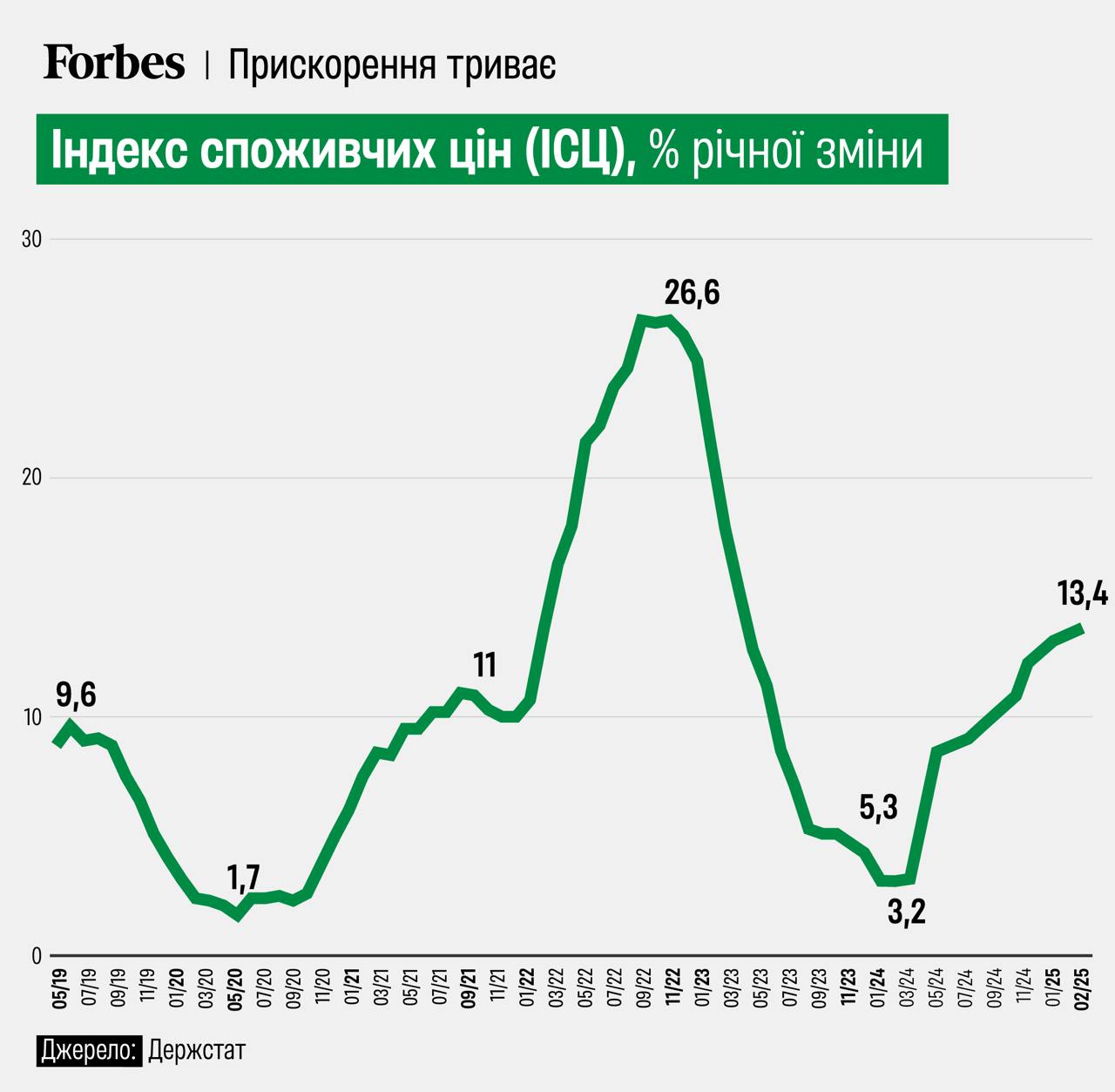 Споживча інфляція в Україні у лютому 2025 року прискорилася до 13,4% у річному вимірі. При цьому у грудні вона становила 12%, а у січні 12,9%.