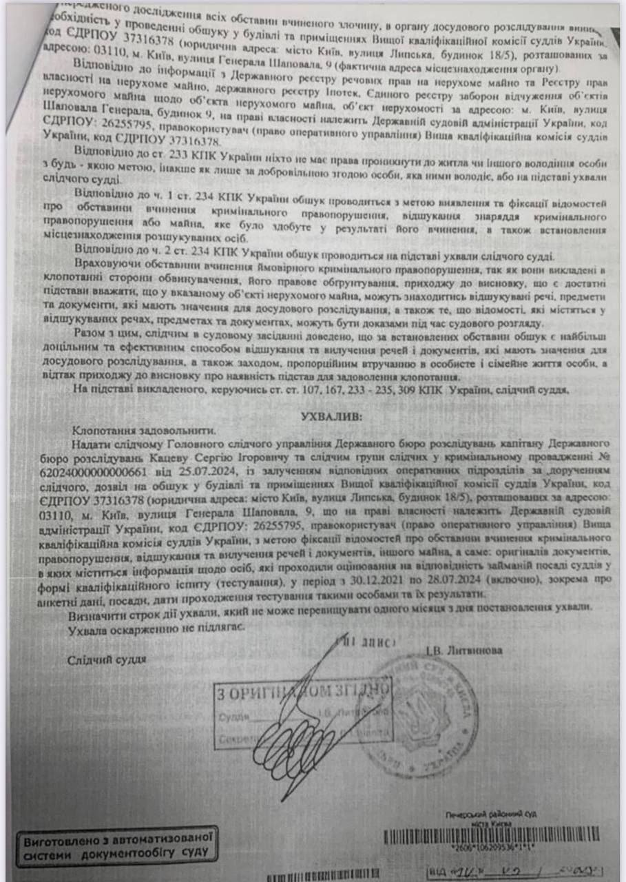 Раніше слідчі вже отримували тимчасовий доступ до документів, пов'язаних із тестуванням суддів у 2021–2024 роках, проте не змогли їх вилучити. Тому суд дав дозвіл на обшук, щоб виявити та вилучити документи та інші матеріали, які мають значення для розслідування.