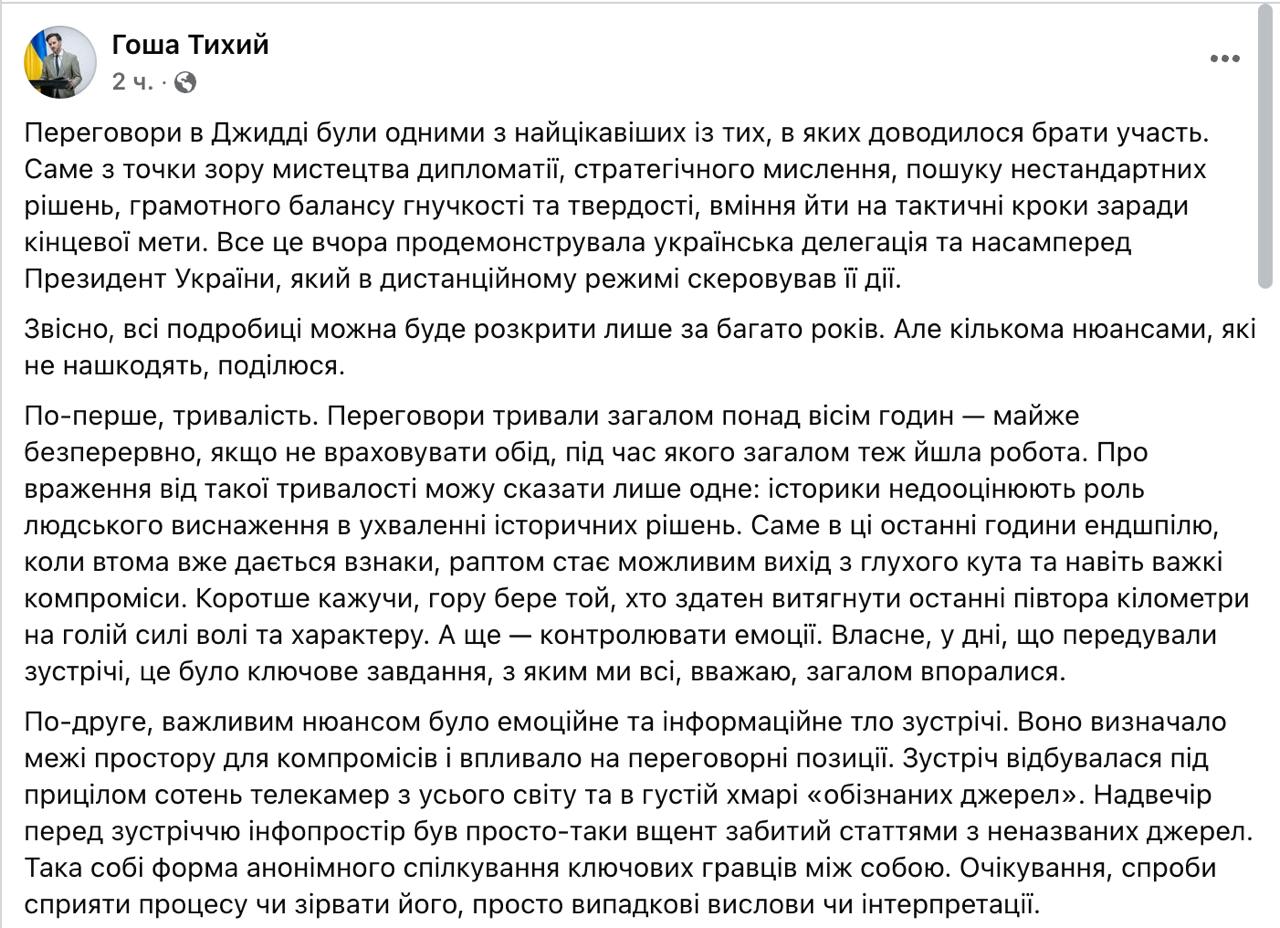 "Саме в ці останні години ендшпіля, коли втома вже дається взнаки, раптом стають можливими вихід з глухого кута і навіть важкі компроміси. Коротше кажучи, верх бере той, хто здатний витягнути останні півтора кілометри на голій силі волі і характеру. А ще - контролювати емоції. ю, загалом впоралися", - написав Тихий.
