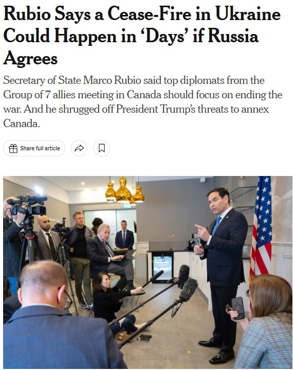"От як би ми хотіли, щоб світ виглядав за кілька днів: жодна сторона не стріляє одна в одну - ні ракетами, ні кулями, ні артилерією... Стрілянина припиняється, бої припиняються і починаються розмови", - сказав Рубіо.