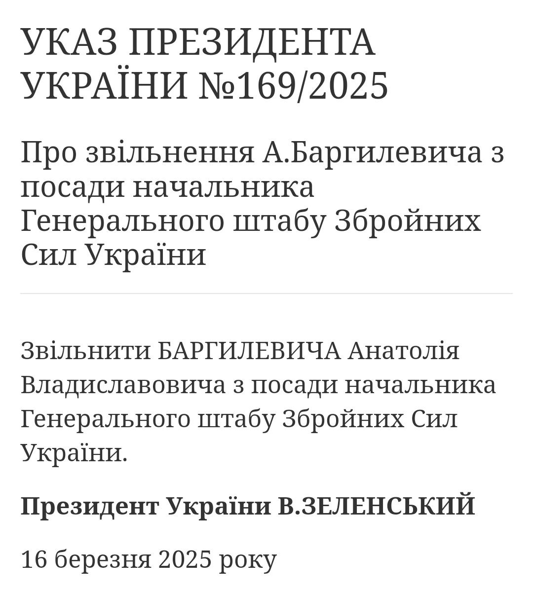 Президент України Володимир Зеленський звільнив із посади голову Генерального штабу Збройних сил України Анатолія Баргилевича.