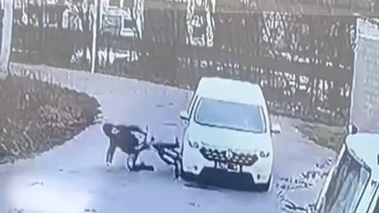 З машини вийшов бородатий чоловік у камуфляжних штанях, звільнив зігнуте переднє колесо велосипеда з-під крила машини і побіг за його власником.