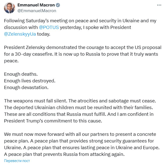 "Тепер ми маємо разом із усіма нашими партнерами рухатися вперед, щоб представити конкретний мирний план. Мирний план, який забезпечує надійні гарантії безпеки для України. Мирний план, який гарантує міцний мир в Україні та Європі", - написав президент Франції.