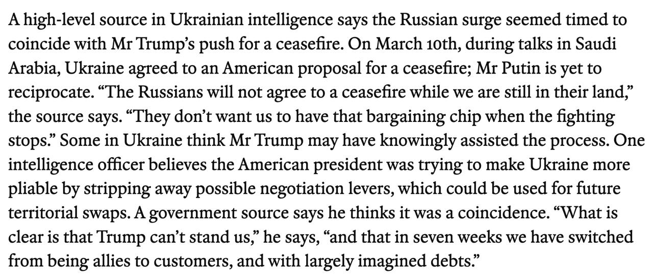 Джерело впевнене, що це не просто збіг. На його думку, росіяни не пішли б на припинення вогню, яке просуває Трамп, без повернення своїх територій на Курщині. І що "американський президент намагався зробити Україну більш поступливою, позбавивши її можливих важелів для переговорів, які могли б бути використані для майбутніх територіальних обмінів".