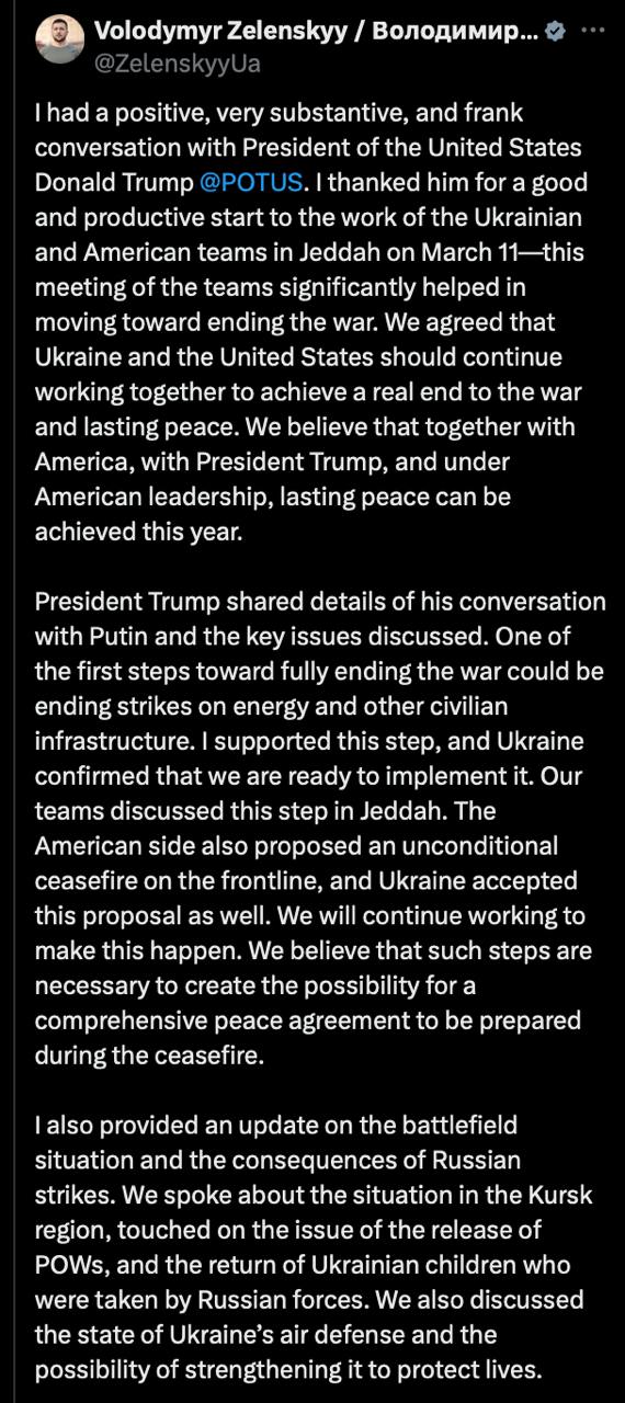 Президент Трамп поділився подробицями своєї розмови з Путіним і ключовими питаннями, що обговорюються. Одним із перших кроків до повного припинення війни може стати припинення ударів по енергетичній та іншій цивільній інфраструктурі. Я підтримав цей крок і Україна підтвердила, що ми готові його реалізувати. Наші команди обговорили цей крок у Джідді. Американська сторона також запропонувала беззастережне припинення вогню на лінії фронту, і Україна також ухвалила цю пропозицію. Ми продовжимо працювати над тим, щоб це сталося. Ми вважаємо, що такі кроки необхідні для створення можливості підготовки всеосяжної мирної угоди в період припинення вогню.