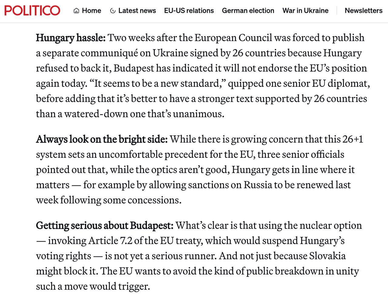 "Схоже, це новий стандарт", - "виразив" високопоставлений дипломат ЄС і додав, що "краще мати сильніший текст, підтриманий 26 країнами (тобто без Угорщини - Ред.), ніж пом'якшений, але одноголосний".