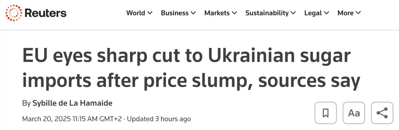 Європейська комісія планує різко скоротити імпорт українського цукру, а пізніше і зерна. Про це повідомляє Reuters із посиланням на джерела.
