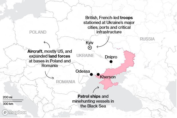 "За найбільш ймовірним планом британські та французькі миротворці розмістяться в основних містах, портах та на об'єктах критичної інфраструктури України. У Чорному морі планується дислокувати патрульні кораблі та мінні тральщики", - пише Bloomberg.