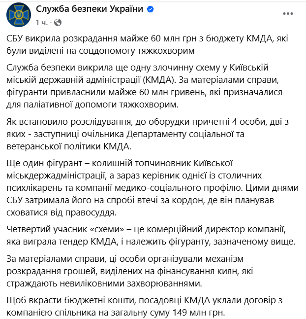 За даними слідства, чиновники привласнили майже 60 млн грн з бюджету, виділених на паліативну допомогу (знеболення та усунення інших важких симптомів).