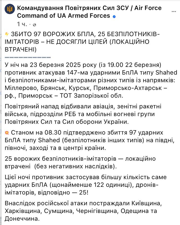 10:15 Вночі росіяни запустили щонайменше 122 "Шахеди", з яких збили 97. І ще 25 дронів-імітаторів були "локаційно втрачені".