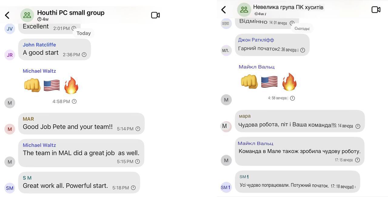 У конфіденційному каналі, крім Уолтца, були віце-президент Джей Ді Венс і міністр оборони Піт Хегсет. Вони обговорювали деталі майбутніх авіаударів по Ємену, включаючи точний час операцій та перелік цілей.