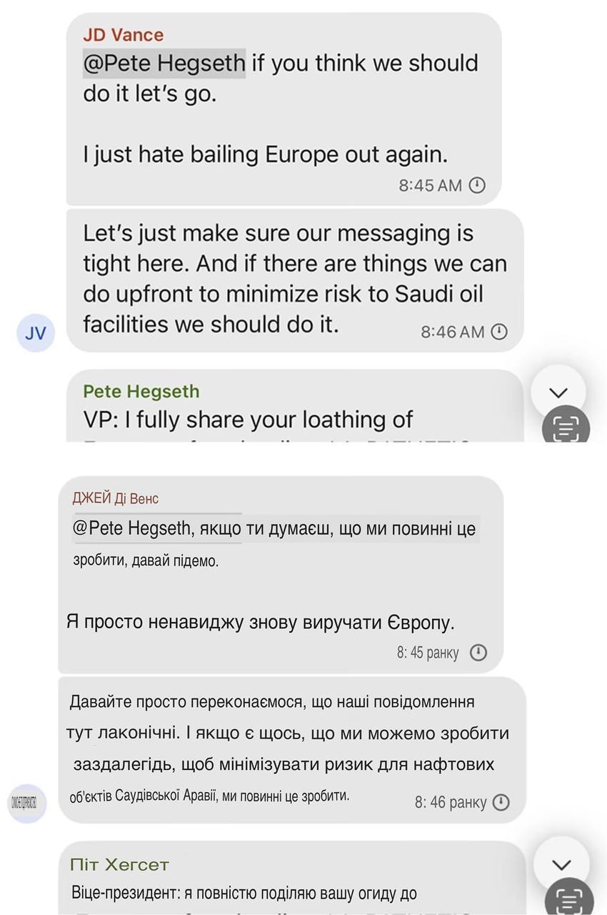У ході листування Джей Ді Венс писав: "Якщо ви вважаєте, що нам слід це зробити (бомбити хуситів - Ред. ), давайте. Я просто ненавиджу знову рятувати Європу". Порятунок Європи, про який говорить Ді Венс, має на увазі твердження США, що атаки хуситів у Червоному морі завдають основної шкоди судноплавству та економіці насамперед європейських країн.