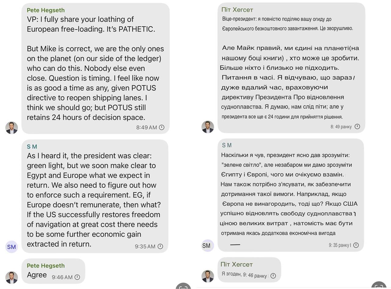 Також в чаті віце-президент США Венс заявив, що важко пояснити американським виборцям доцільність ударів по хуситах у Ємені, на що Хегсет йому відповів: "Важко зрозуміти, як розвиватиметься більшість важливих питань: економіка, світ в Україні, Газа тощо".