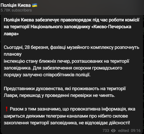 Поліція підтвердила, що прибула на територію Києво-Печерської лаври задля забезпечення правопорядку під час роботи комісії.