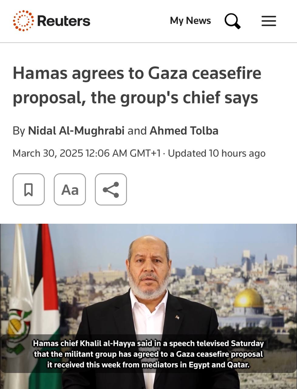 "Два дні тому ми отримали пропозицію від посередників з Єгипту та Катару. Ми поставилися до нього позитивно і прийняли її", - заявив Халіль аль-Хайя у своєму телевізійному виступі.