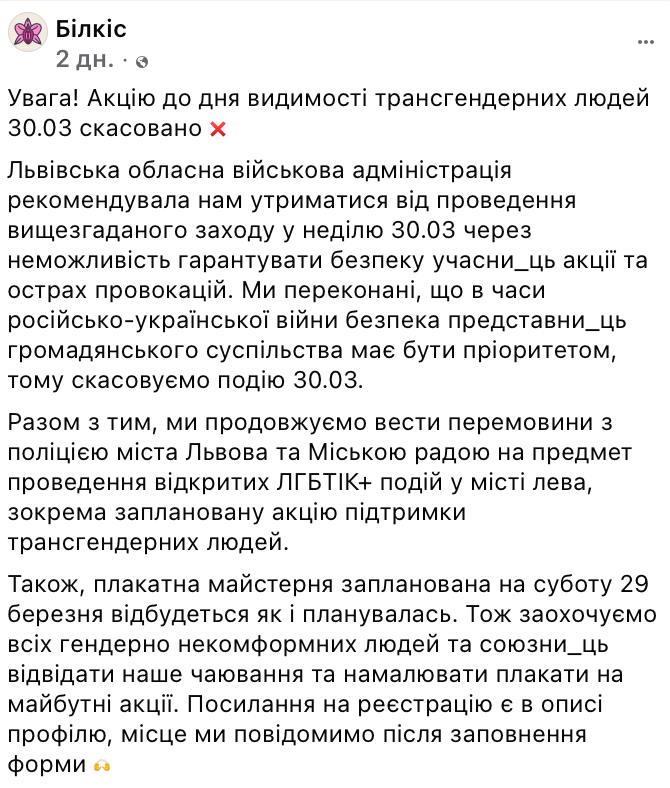 "Львівська обласна військова адміністрація рекомендувала нам утриматися від проведення вищезазначеного заходу в неділю, 30.03, через неможливість забезпечити безпеку учасниць акції та страху провокацій", - заявили організатори.