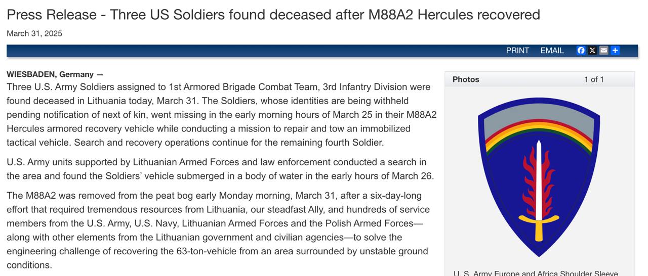 Нагадаємо, 26 березня в литовському Пабраді після навчань на місцевому полігоні імені генерала Сильвестраса Жукаускаса виявилася зникнення чотирьох американських військовослужбовців та гусеничного транспортного засобу. ЗМІ гарячими слідами написали про загибель військових.