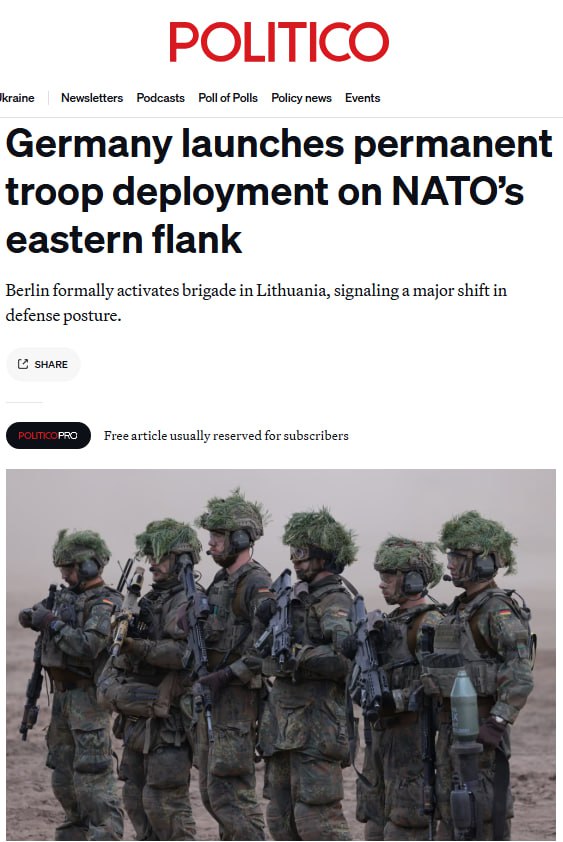 Німеччина вперше з часів Другої світової війни розгорнула постійну військову бригаду за кордоном. Бригада чисельністю 5 тисяч осіб дислокуватиметься на військовій базі у містечку Руднінкай у Литві за 30 кілометрів від кордону з Білоруссю.