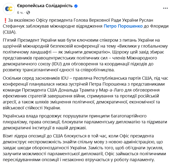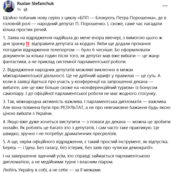 Заяву "Євросолідарності" прокоментував сам Стефанчук. За його словами, заявка на відрядження надійшла вчора ввечері, з "вимогою відправити депутата за кордон вранці того ж дня".