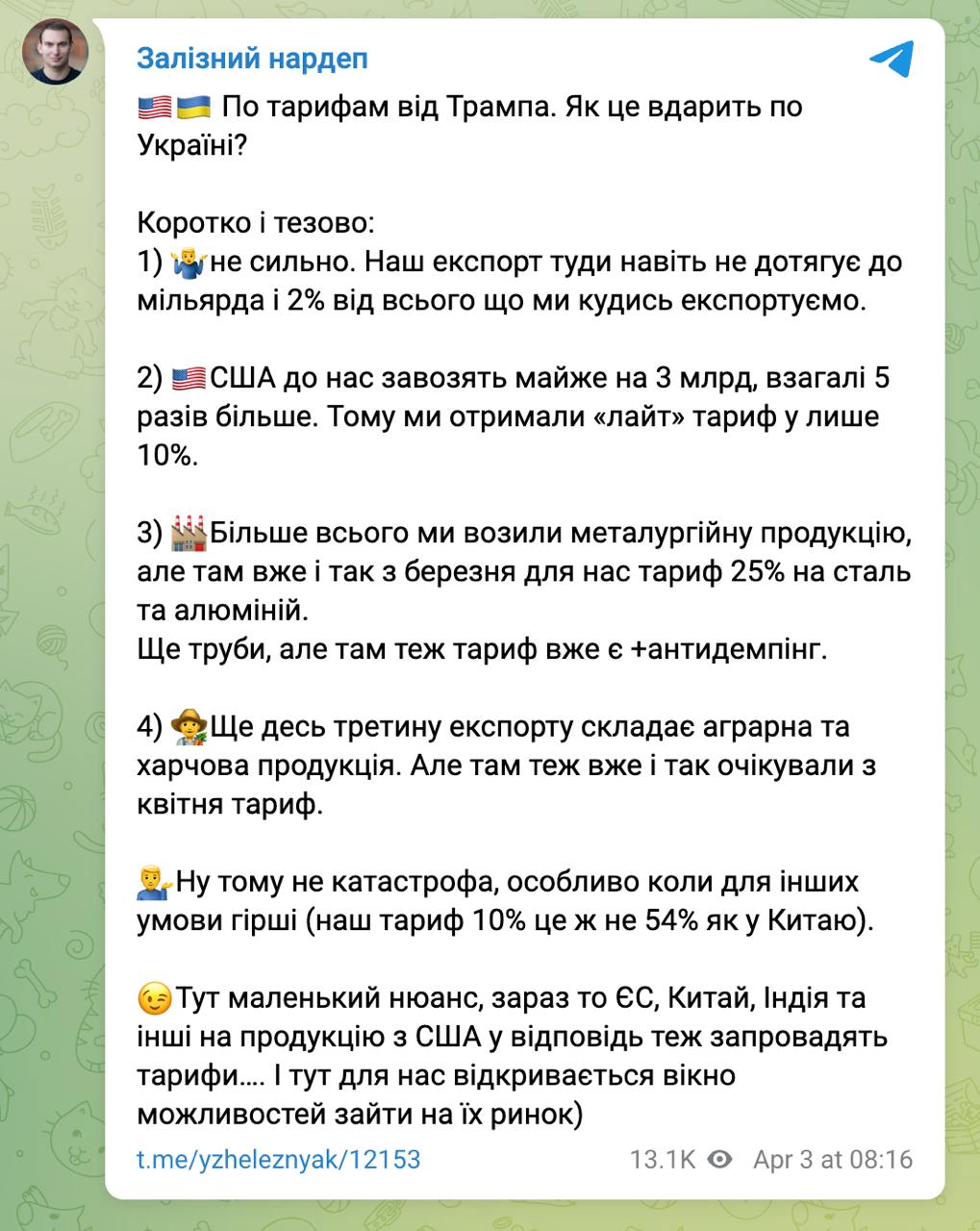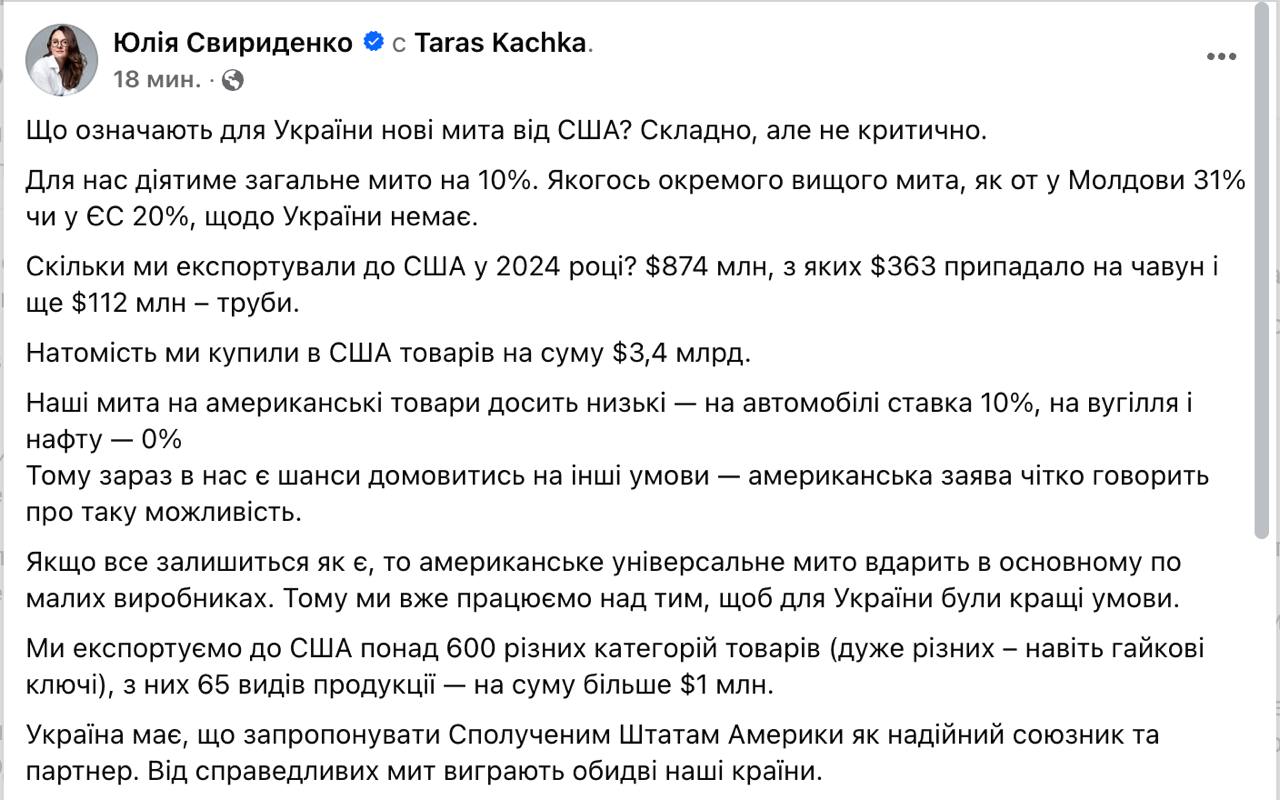 "Наш експорт туди (у США - Ред.) навіть не дотягує до мільярда і 2% від усього, що ми кудись експортуємо. США до нас завозять майже на 3 млрд, взагалі 5 разів більше. Тому ми отримали "лайт" тариф всього в 10%. Найбільше ми ввозили металургійну продукцію, але там вже є +демпінг", - пише Желєзняк.