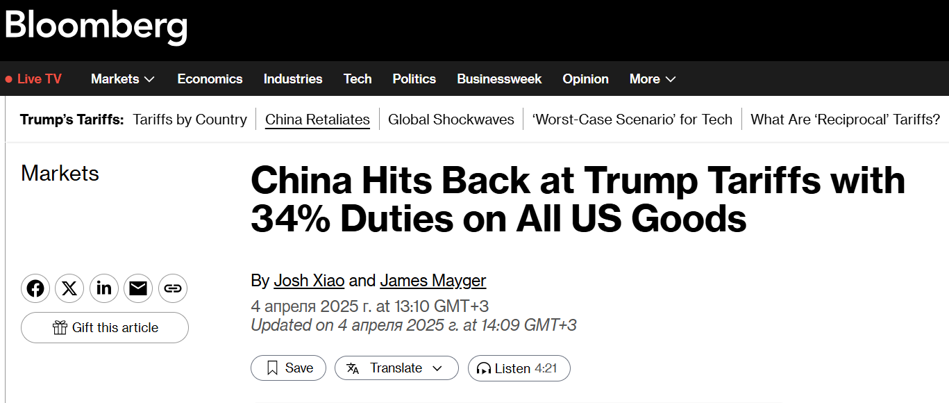 34% на весь імпорт американської продукції. Китай вводить тарифи у відповідь США