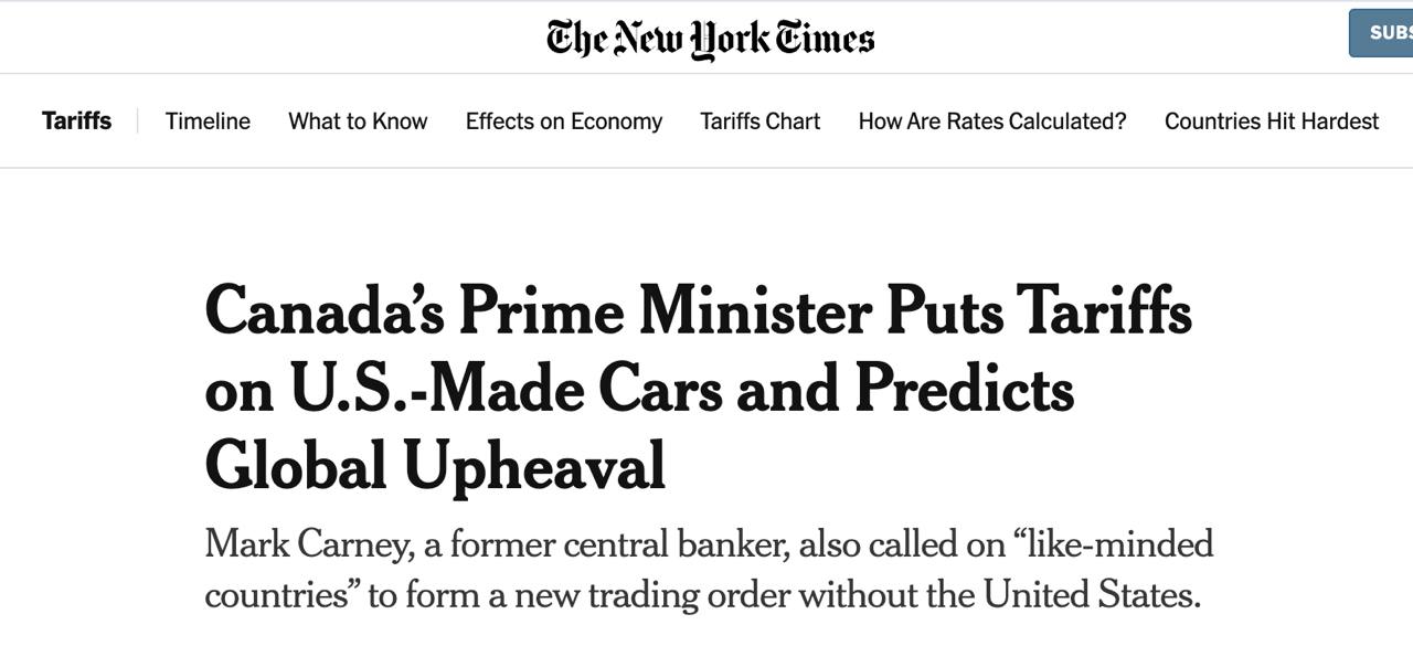 "Якщо Сполучені Штати більше не хочуть бути лідерами, тоді їм стане Канада. 80-річний період, коли США несли прапор глобального економічного лідерства, створювали союзи, засновані на довірі та взаємній повазі, і відстоювали вільний і відкритий обмін товарами та послугами, підійшов до кінця."