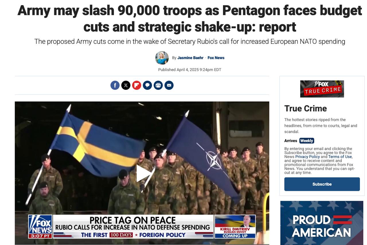 Телеканал Fox News нагадує, що міністр оборони Сполучених Штатів Піт Хегсет домагається скорочення бюджету Пентагону на 8%, а армія при цьому зміщує акцент із європейського спрямування на контртерористичні завдання. У Пентагоні очікують, що армія стане "більш компактною, високотехнологічною та мобільною".