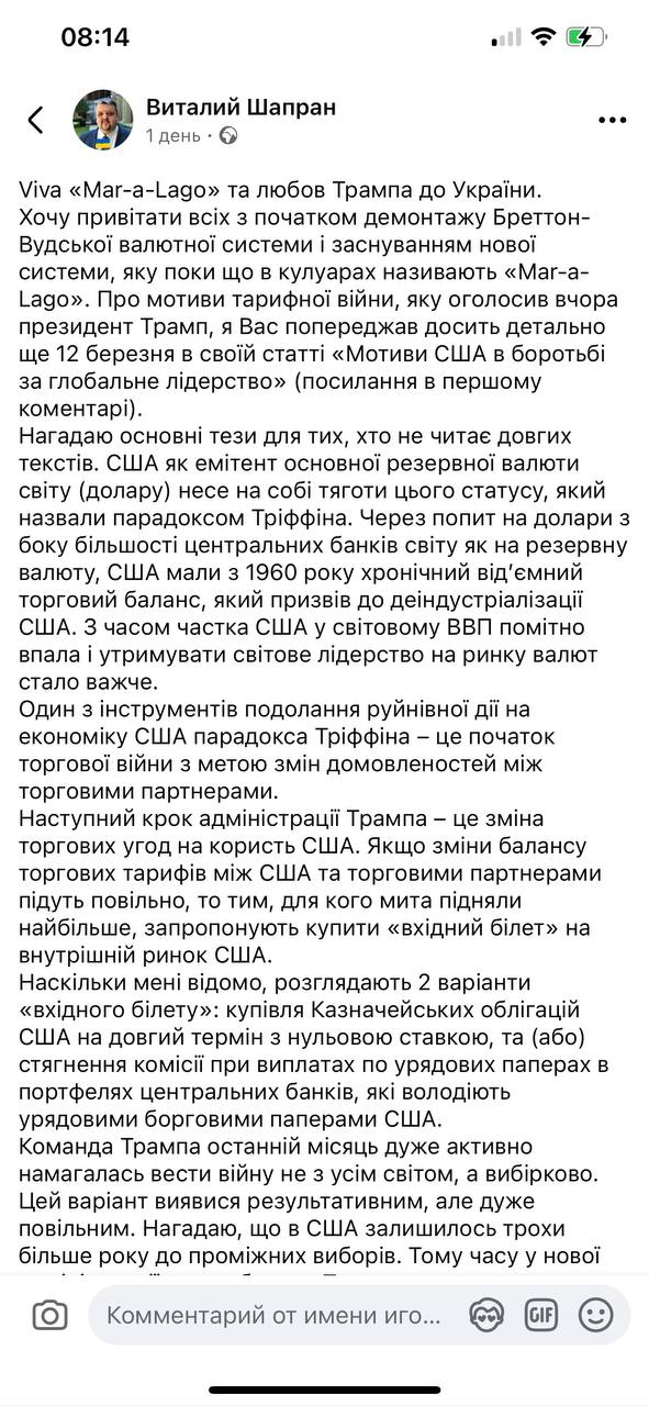 "Наскільки мені відомо, розглядають два варіанти "вхідного квитка": купівля казначейських облігацій США на тривалий термін з нульовою ставкою та (або) стягнення комісії при виплатах урядових паперів у портфелях центральних банків, які володіють американськими урядовими борговими паперами", - заявив Шапран.