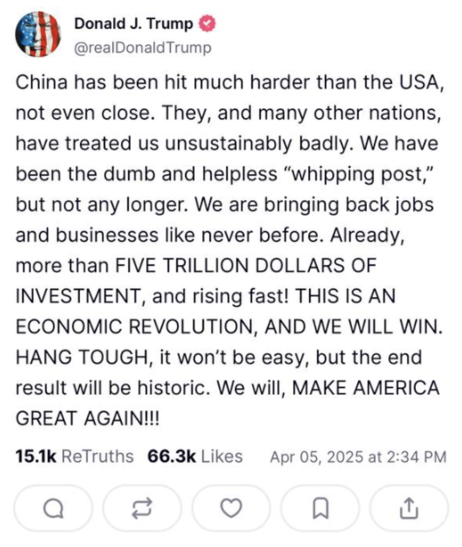 "Китай постраждав набагато сильніше, ніж США, навіть близько не постраждали. Вони і багато інших країн ставилися до нас погано. Ми були тупим і безпорадним "місцем для порки", але більше не будемо. Ми повертаємо робочі місця та бізнес, як ніколи раніше. Вже понад п'ять трильйонів доларів інвестицій і швидке зростання. Це економічна революція. Ми зробимо Америку знову великою, - написав Трамп.