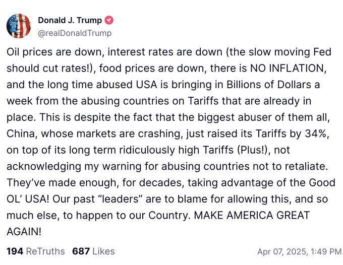 "Ціни на нафту знижуються, відсоткові ставки падають (повільний ФРС має знизити ставки!), ціни на продукти харчування знижуються, інфляції немає, а довгий час США тепер щотижня отримують мільярди доларів від країн, які раніше їх використовували, завдяки вже введеним тарифам", - написав Трамп.