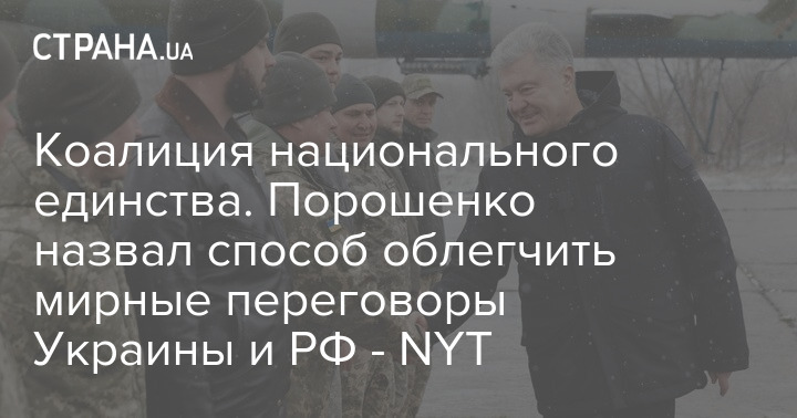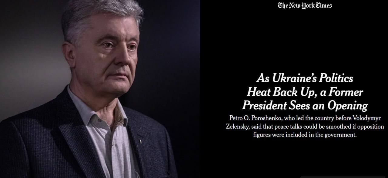 Американська газета The New York Times присвятила статтю колишньому президентові України Петру Порошенку, який в інтерв'ю виданню заявив, що мирні переговори з РФ можуть пройти гладкіше, якщо до уряду увійдуть представники опозиції.