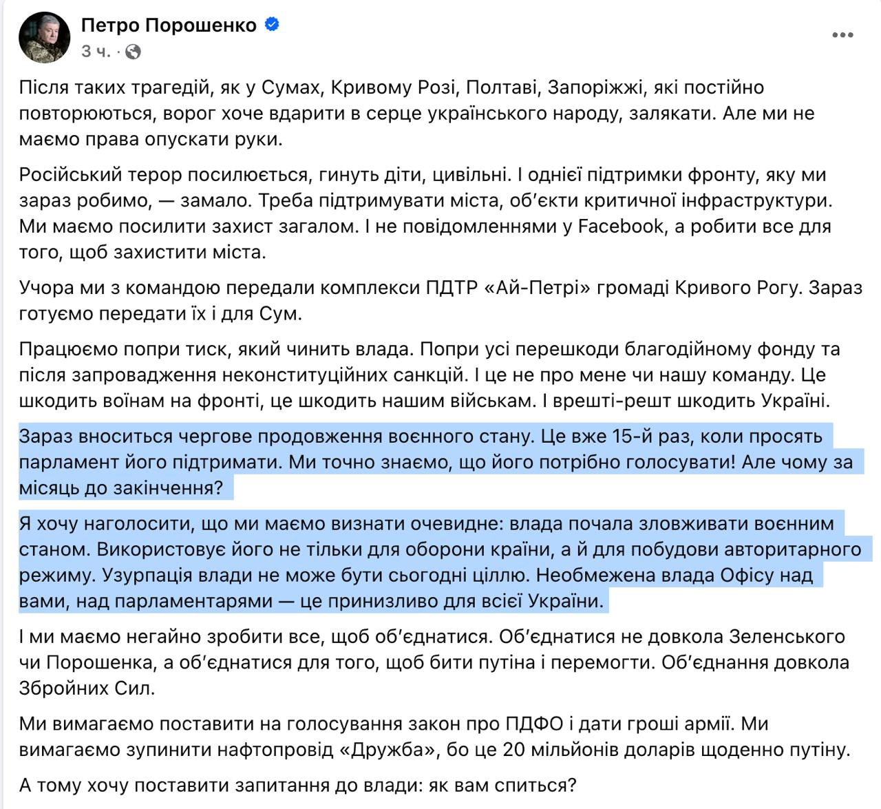 "Зараз вноситься чергове продовження військового стану. Ми точно знаємо, що його потрібно голосувати! Але чому за місяць до закінчення? Ми маємо визнати очевидне: влада почала зловживати військовим становищем. Використовує його не лише для оборони країни, а й для побудови авторитарного режиму. Узурпація влади не може бути сьогодні метою", - написав Порошенко.