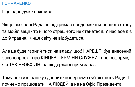 Пізніше він також написав, що "якщо сьогодні Рада не підтримає продовження військового стану та мобілізації – нічого страшного не станеться. У нас все діє до 9 травня. Кінця світу не відбудеться".